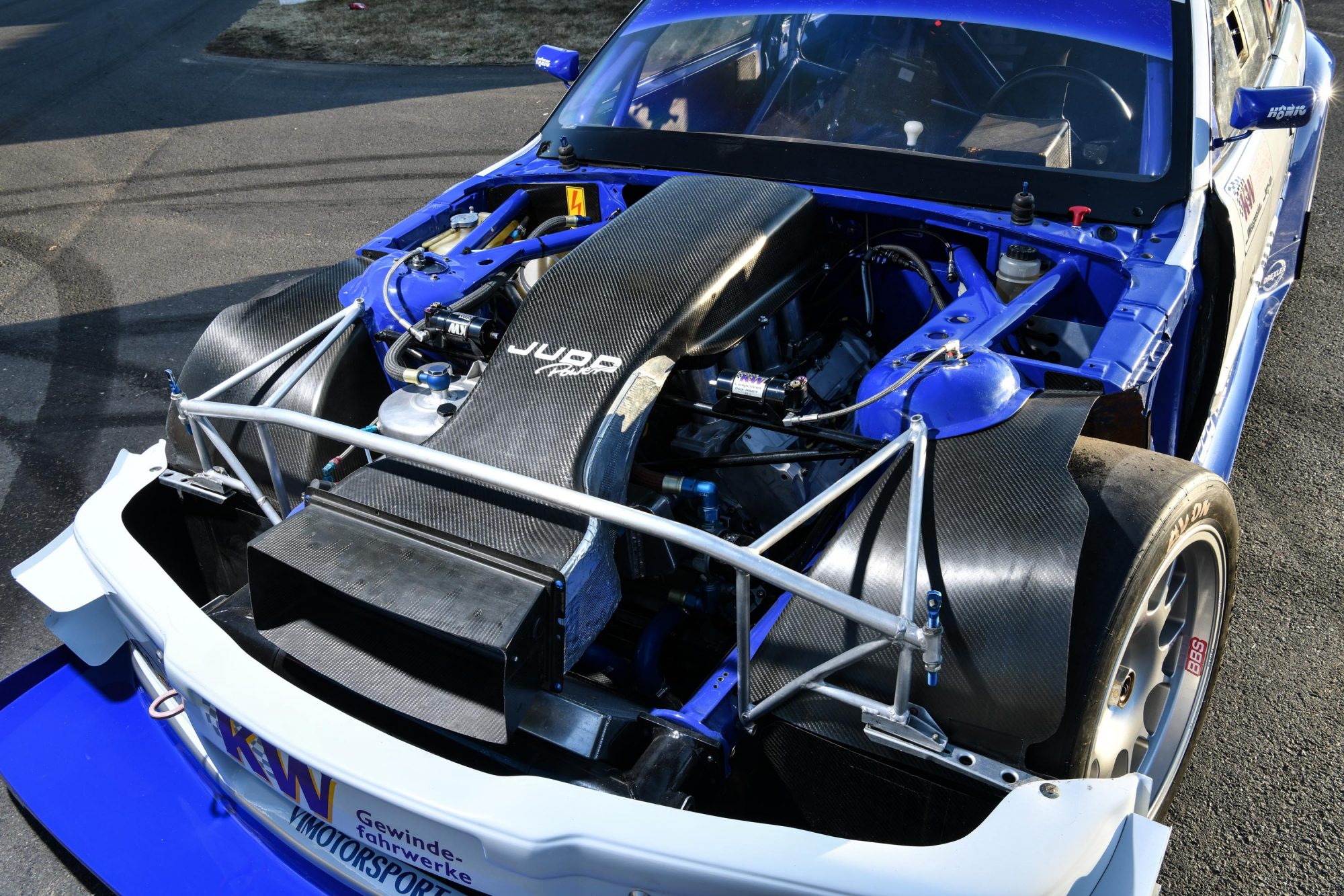 Surprisingly, between the suspension turrets, the shell is all original BMW, as per the FIA E1 class rules, but everything else was stripped out in a ruthless effort to save as much weight as possible. If anything could be made with carbon fiber it was, including, incredibly, the drive shaft and half shafts. Plasa worked closely with KW to develop the special three-way adjustable racing suspension setup, which in conjunction with the front and rear anti-roll bars could be tweaked to the optimum spec for each event. The top mounts were made with magnesium and the center lock spindles for each wheel were cast from titanium.